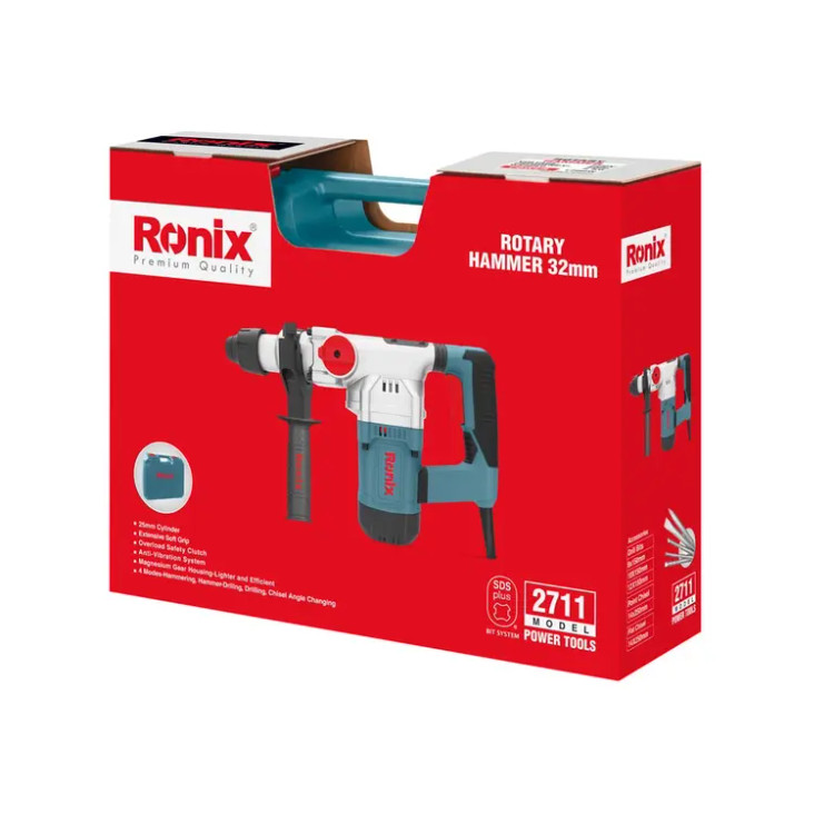 بتنکن 32 میلیمتری رونیکس با مدل 2711، مجهز به موتور گیربکسی صنعتی و قدرتمند 1200 وات است که سرعتی بالغ بر 1050 دور بر دقیقه را ایجاد میکند و نرخ ضربه آن 4200 ضربه بر دقیقه است. مجموعه ابزارگیر این دستگاه، چهارشیار (SDS PLUS) و ضد غبار با ظرفیت 32 میلیمتر بوده و متناسب با سطوح چوبی، فلزی و بتنی طراحی شده است.