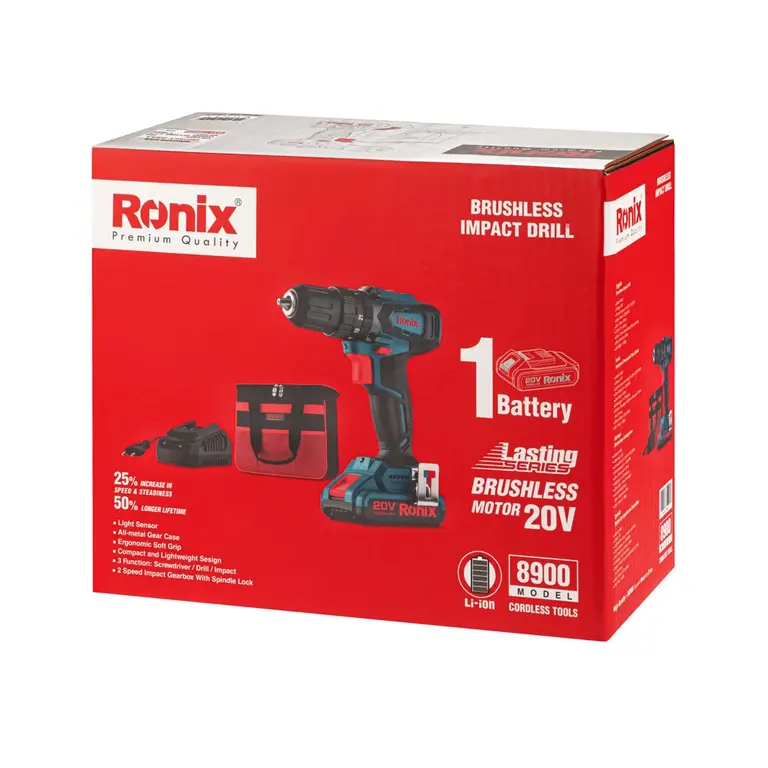 موتور براشلس و مقاوم به رطوبت و غبار در دریل پیچگوشتی 8900 رونیکس، انرژی مورد نیاز خود را از یک عدد باتری لیتیوم یون 20 ولت با طول عمر و دوام بالا تامین میکند. این موتور، 50% طول عمر بیشتر و 25% سرعت و یکنواختی عملکرد بیشتری را از خود نشان میدهد.