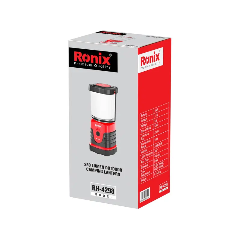 استفاده از ابزار روشنایی کارآمد در کمپینگ و سفر ضروری است. رونیکس مدلهای متنوع و باکیفیت ابزار روشنایی را طراحی و تولید میکند تا پاسخگوی نیازهای شما باشد. چراغ روشنایی فانوسی باتریخور 250 لومن رونیکس مدل RH-4298، انتخابی حرفهای و با طراحی سنتی برای استفاده در محیط باز و کمپینگ است.