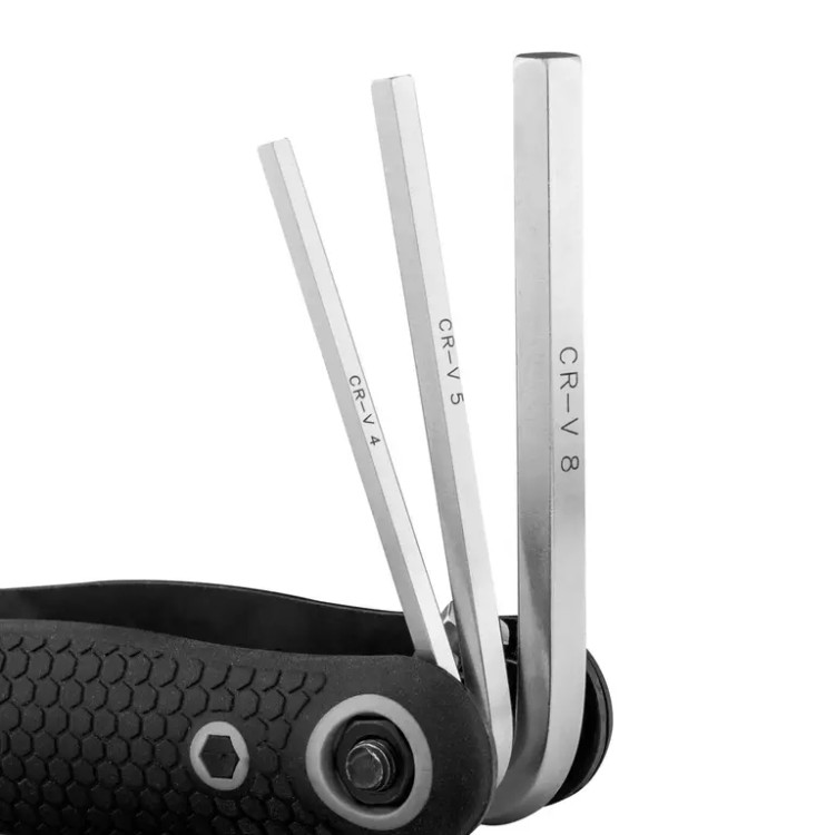دسته تاشو این ست آچار آلن، هر آچار را محکم نگه میدارد و کار با آن را راحت و سریع میکند. سایزهای این مجموعه شامل H1.5، H2، H2.5، H3، H4، H5، H6 و H8 بوده و همه اندازههای کاربردی را شامل میشود.