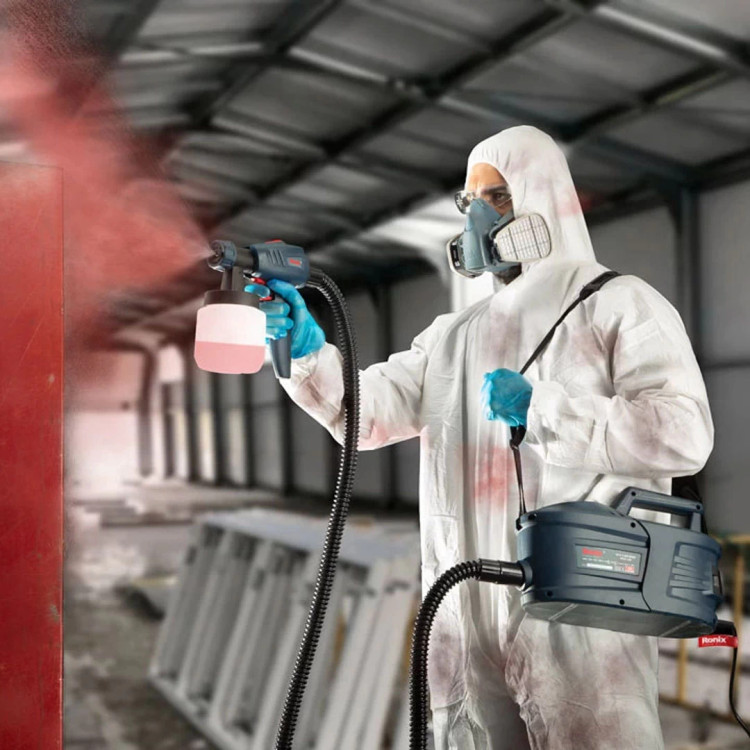 پیستوله برقی رونیکس مدل 1395 با مکانیزم HVLP (حجم بالا، فشار کم) و موتور قدرتمند 950 وات، گزینهای ایدهآل برای اجرای پروژههای رنگکاری صنعتی است. این پیستوله، تحت سیستم HVLP کار میکند. در این سیستم، حجم رنگ زیاد بوده و فشار هوا کم است. به همین دلیل، ذرات رنگی بیشتری روی سطوح قرار میگیرند. حاصل کار، رنگ پوششی با ضخامت و کیفیت بیشتر در سطوح مختلف است.